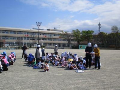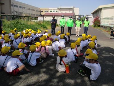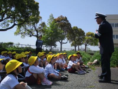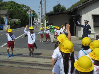 今日は、2年生が「まち探検」の学習のひとつとして交通指導員さんのお話を聞きました。
