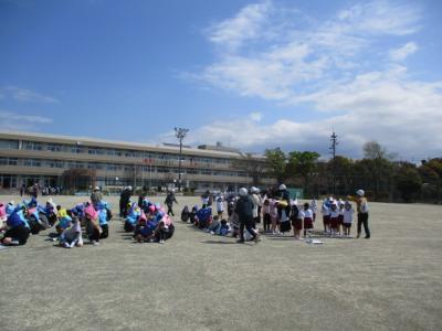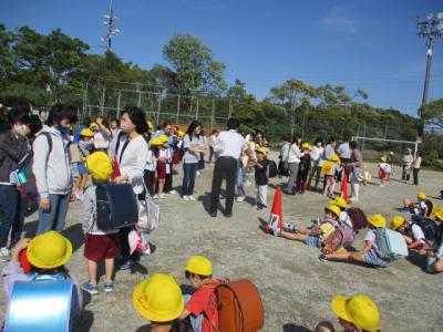 <それぞれに運動場に避難してきて、学年・学級ごとに並びます>