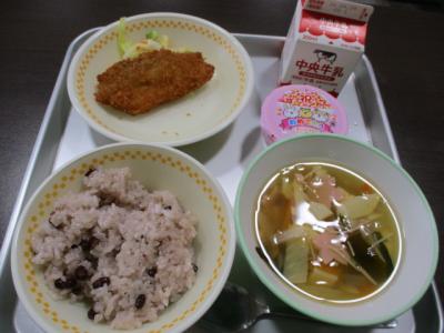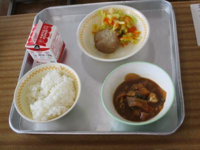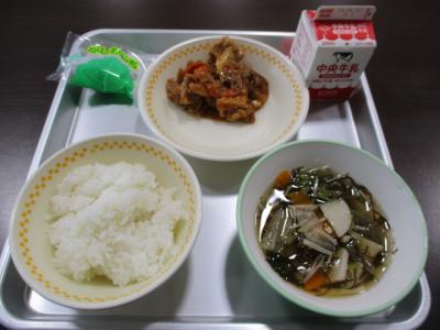 ・ごはん、イワシのかば焼き、赤しそあえ、肉じゃが、節分豆、牛乳