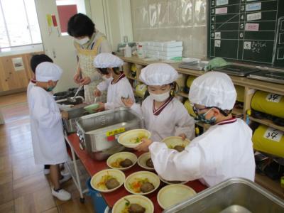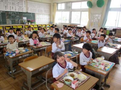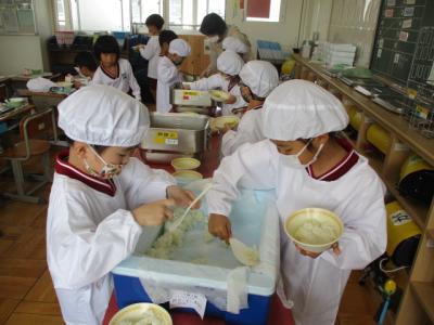 <5年生:家庭科と総合的な学習 家庭科で勉強したことをいかしてお茶を入れました。丹精込めて作って収穫したお米を炊いておにぎりに!お家の方にも食べてもらえてよかったね。総合の発表もしっかりと聞いていただきました>