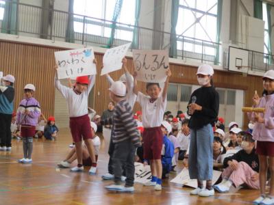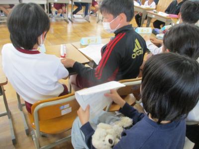 <「こんなところに○○があるよ!」「えー、~~だねぇ」「わあ~、びっくりしたよ、△△だと思ったよ」などと、想像力を働かせて会話をつないでいきます。班で発表もしました。