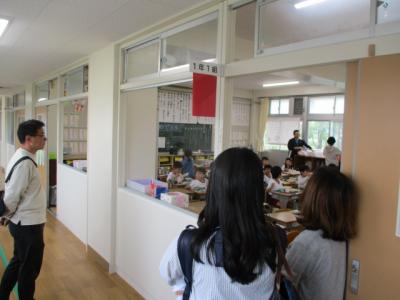 <1年生は、班長さんの作品や兄弟姉妹の作品を見つけて喜んだり、「こんなきれいな作品はどうやって作るのかな」と先生に質問したりして初めての芦原っ子ギャラリーを楽しんでいました>