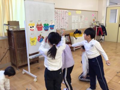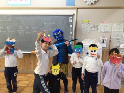 おおぞら2組が、自立活動の時間に色紙をちぎって貼りつけて、素敵なお面を作りました。2月4日の授業で、お面を作って、自分の中の鬼(おこりんぼう鬼など)をやっつける活動をすると言ったので、鬼の扮装をして教室に入っていきました。はじめは「鬼だ!」とびっくりした様子でしたが、最後には「自分の中の鬼をやっつけたよ」と言ってきたので、鬼と仲よく写真を撮りました。また、朝会でも伝えた『誰もがもっている心の「福」が増えて、「鬼」が減っていくといい』という話をしました。