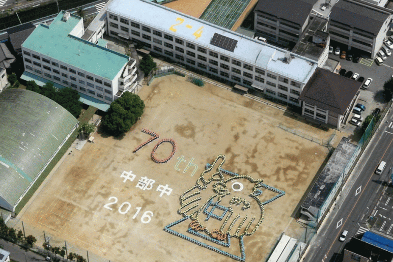 中部中学校は、豊橋市の中心部に位置し、全校生徒約600人の学校です。生徒会のスローガンである「OVER the TOP」を合い言葉に、生徒たちは毎日元気に学校生活を送っています。