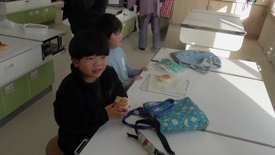 子どもたちは焼き上がりを待つ間、いったん帰り支度で教室に戻り、再びこんがり焼きあがったパンと出合うために階段を上がっていくことになりました。階段を上がる子どもたちの足音に続いて、わたしも再び家庭室を訪れました。教室いっぱいに広がる焼きあがったパンの香りを体いっぱいに浴びることができました。
