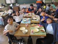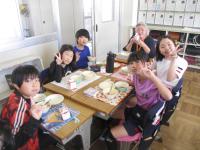 給食の時間には、学校運営協議会の皆様と消防団の方々に、高学年の教室で一緒に給食を食べていただきました。