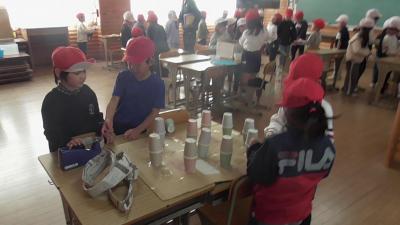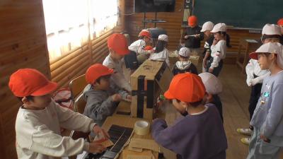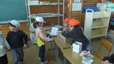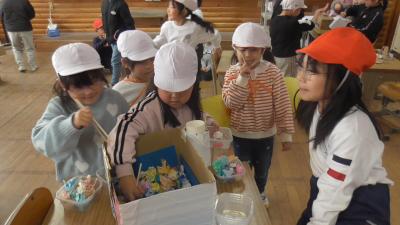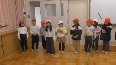 明日、2月4日は令和8年度入学児の保護者のみなさまを対象とした「入学説明会」が開催されます。同日の午前中には、1年生は、校区にある磯辺保育園、長栄保育園の年長児を招いて、「お店屋さん」の交流会を開催します。2月2日は、その練習を兼ねて、お互いの「お店屋さん」を体験していました。帽子で園児役を分けています。
