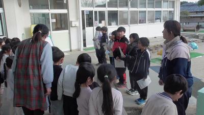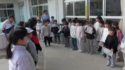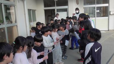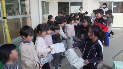 1月27日(火)に3年生が行うダイコン販売に向けて子どもたちが作成した「チラシ」をお隣の磯辺保育園に届けてきました。各クラスで代表児童を募り、出発前に練習をして出かけました。