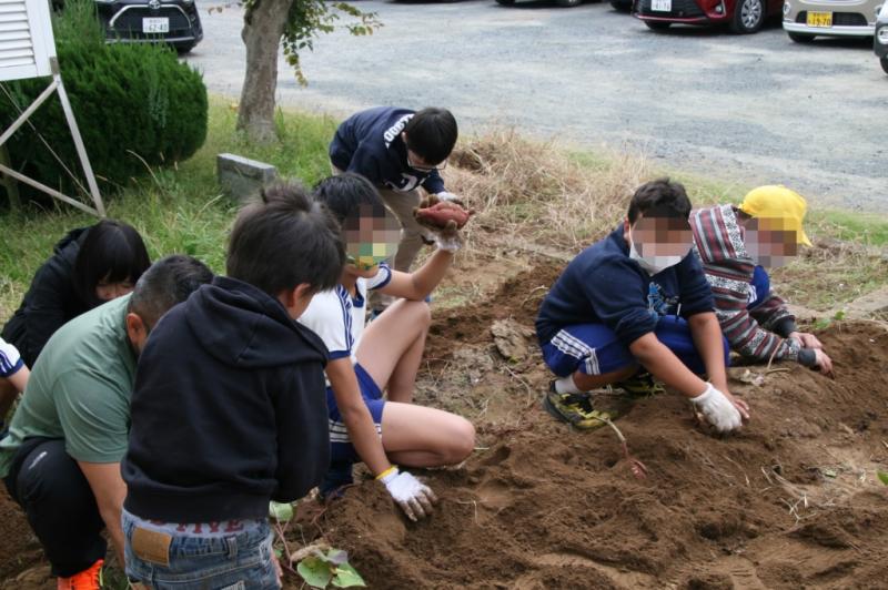芋ほりをしました。コンテナいっぱいのサツマイモが取れました。