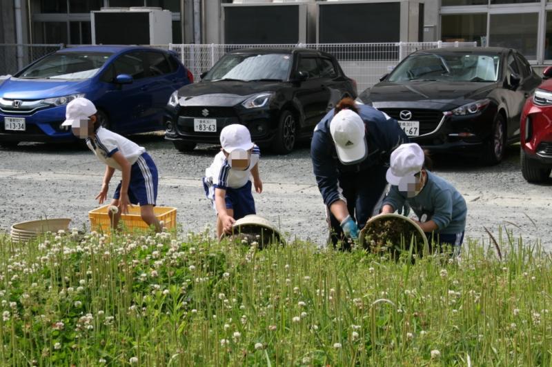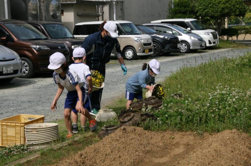 みんなの心がけのおかげか,曇り空の下で,草取り活動を行いました。昨夜の雨はあったものの,しっかり根を張った草を抜くのは大変でした! 写真は草取り後の花の苗植えの活動です。
