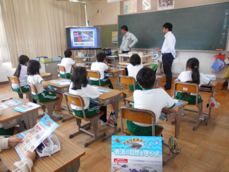 表浜に産卵する「アカウミガメ」について、市役所・環境保全課の方から教わりました。タイマイの標本を目の前にして、関心を高めました。