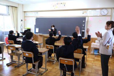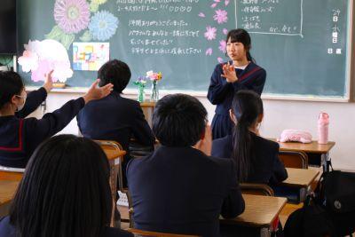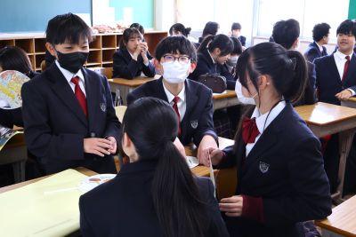 校舎内にとても楽しそうで大きな笑い声が響いているので探ってみると、3年生英語『英語 de 縁日』でした。3限に1組、6限に2組が多目的室で活動していました。ゲームやクイズ、体験コーナー?…。それぞれのグループで準備した企画で、お客さんを楽しませます。もちろん、お店の店員もお客さんも英語しか話せません。企画の楽しさと、必死で英語で伝えようとするおもしろさで、多目的室はとても盛り上がっていました。3年生のみなさん、さすがです!