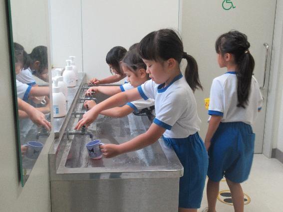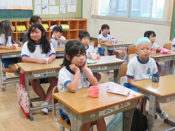 すぐそばの1年1組教室をのぞいてみると、2学期最初のフッ素洗口中でした。