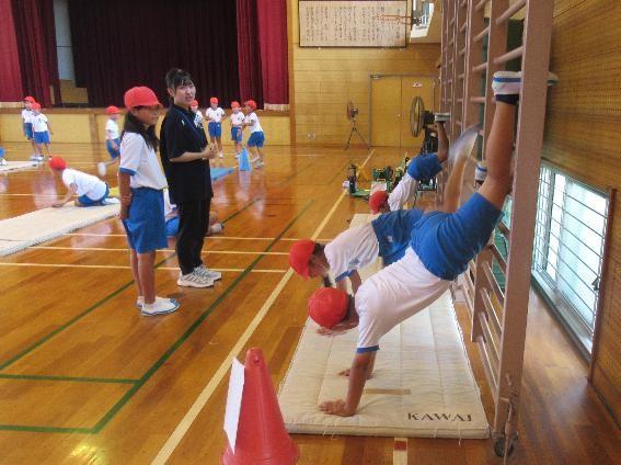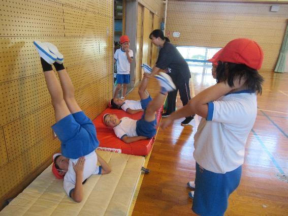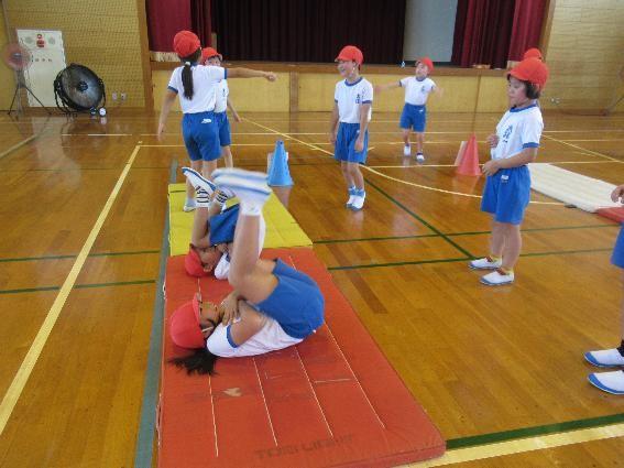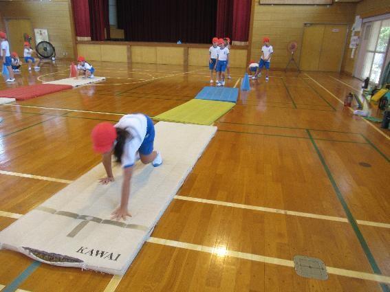9月の体育はマット月間。体育館でマットを使って、学年ごとにさまざまな運動に取り組みます。日中、マットはフロアに出したままです。授業の始めと終わりに1回1回準備や片づけをしなくてすむので、たくさん活動時間を確保できます。