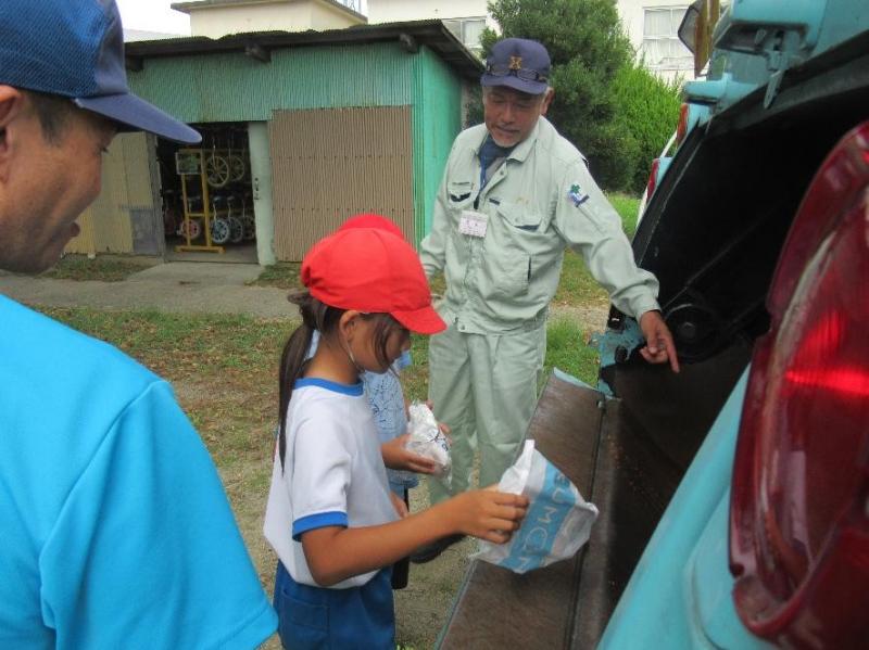 後半は外に出て、ごみ収集車にごみの投入体験をしました。日頃見なれている収集車ですが、ちょっぴり緊張の面持ちです。