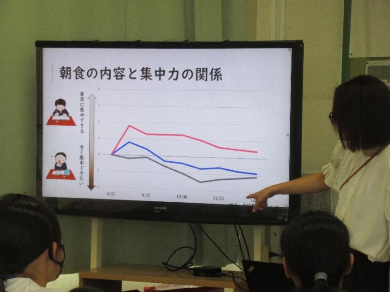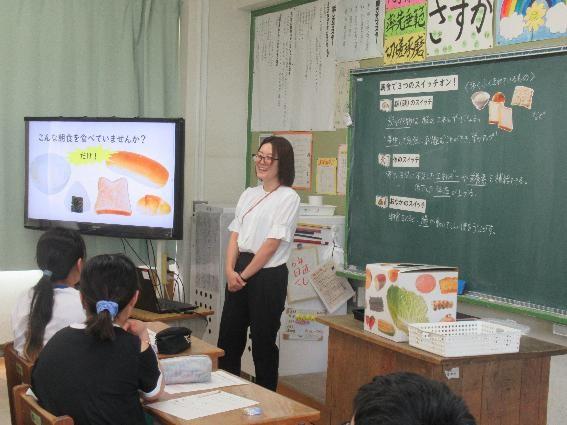 12日(金)は、栄養教諭の齋藤先生が6年生の家庭科の授業に来てくださいました。テーマは「朝食」です。