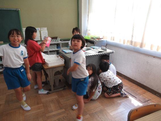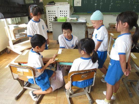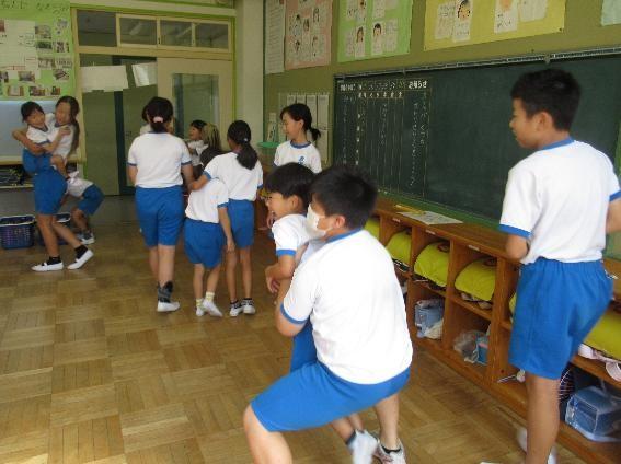 9月も折り返し地点を過ぎました。にもかかわらず、17日(水)は10時過ぎですでに暑さ指数が、「危険」の領域になってしまいました。そのため、ニコニコタイムに外遊びに出ることができません。各教室で子どもたちはどうやって過ごしているのかと思いながら、北校舎に向かっていると… 「抱っこする?」移動教室帰りの6年生が、渡りでもう1年生に声をかけていました。6年生は1年生がかわいくてたまらないようです。1の1教室まで行くと、すでに何人もの6年生が遊びに来ていました。