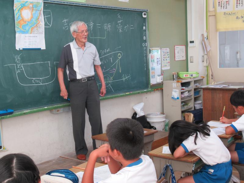社会科の「郷土の発展につくす」という単元をESDの視点で捉え、4年生は「かがやく文化を受け継ぎ、未来へとつなぐ」というテーマで総合的な学習に取り組みました。かつて漁業が盛んだった老津が、どうして現在のような農業が盛んな地域へと変化してきたのか、昔の地図や郷土史から疑問に思ったことを調べ、さらには地域の古老から話を聞き、追究していきました。そして、自分たちが調べてわかったことを全校児童や地域に向けて発信しました。その締めくくりには、漁業から農業に切り替える際の苦労に思いをはせ、諦めずに努力し続けたことに敬意をはらい、今後もこのことを語り継いでいきたいという思いをもちました。