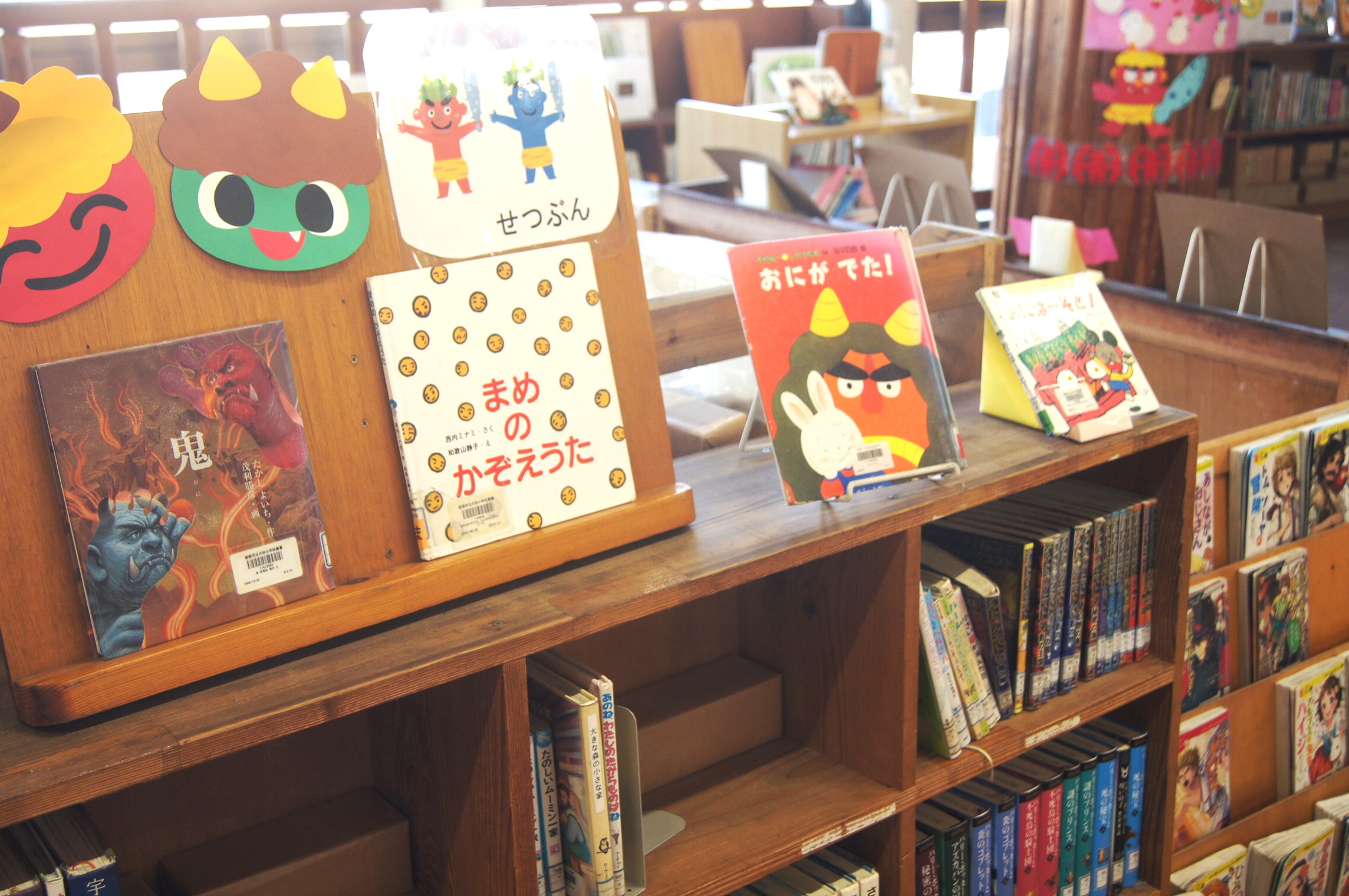 せつぶんコーナーに、関連した図書が配架されていました。