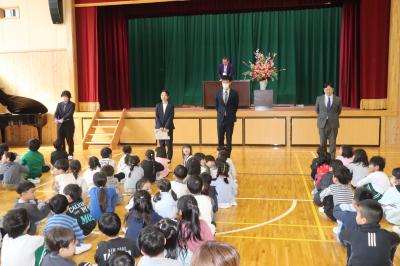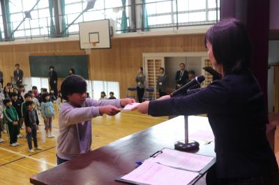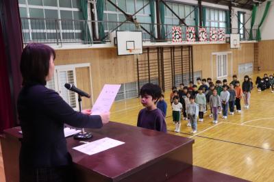 朝礼の中で,2学期に取り組んだ理科スケッチ展や夏休みに取り組んだ作品で優秀な成績を収めた子の表彰を行いました。