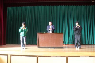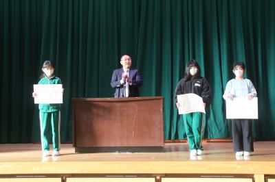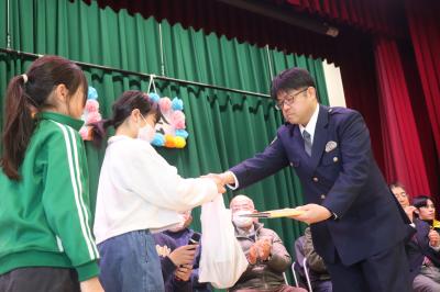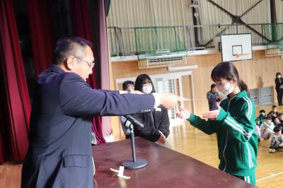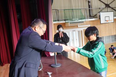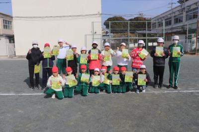 ポスターコンクールで優秀な成績を収めた子,体力テストで体力章をとった子の表彰を行いました。