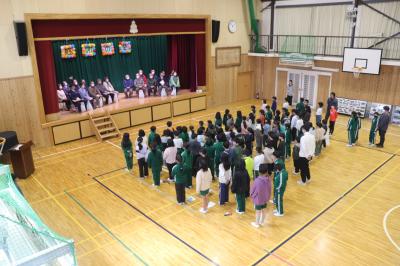 運営委員会の司会のもと,図書ボランティア・農業ボランティア・おいも先生・汐川干潟を守る会・駐在・交通指導員・杉山保全隊・明海地区自治会のかたがたへ,お礼の手紙と教室で育てた鉢花を贈りました。学校生活や授業等で何度もふれ合っているかたがたなので,子どもたちにとって身近な存在であり,「あっ〇〇さんだ!」と名前を呼んで手を振っている子もいました。最後に『あなたにありがとう』を全校合唱しました。