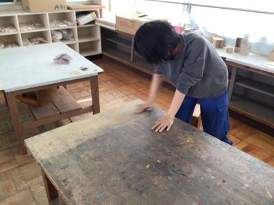 ・汚れのひどかった図工室の机をやすりで削ってきれいにしました。