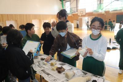 筆職人のかたやスタッフのかたに教わりながら,練りまぜられ,竹軸に接着させた毛を,専用ののりで固め,糸でねじって余分なのりを落として筆の形を整え,筆作りにおける仕上げの工程を体験することができました。