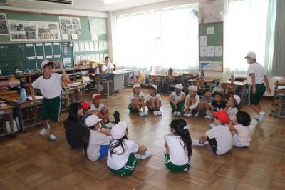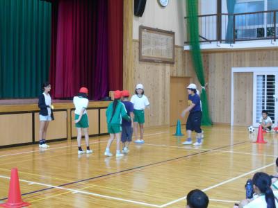 児童集会で全校のみんなに遊び方やルールを説明し,お手本を見せてくれました。