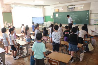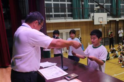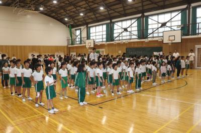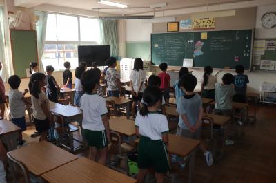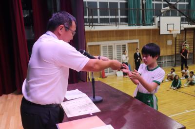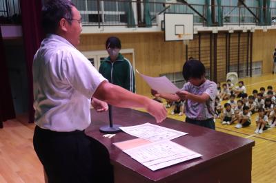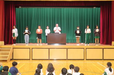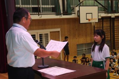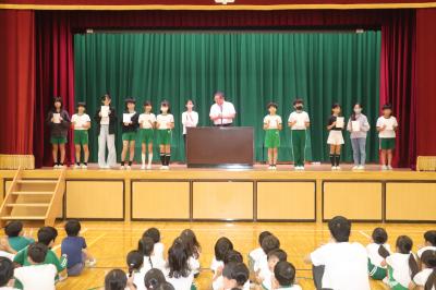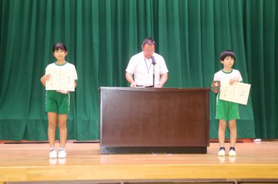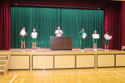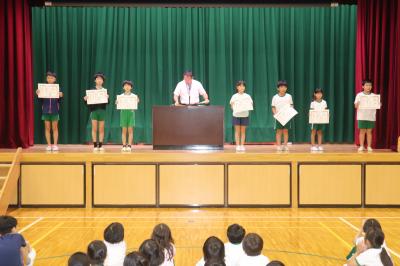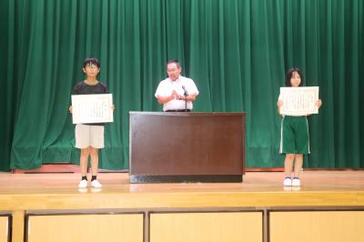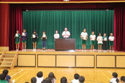 全校朝礼の中で,夏休みの作品で優秀な成績を収めた子の表彰を行いました。