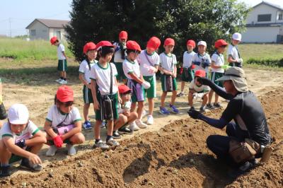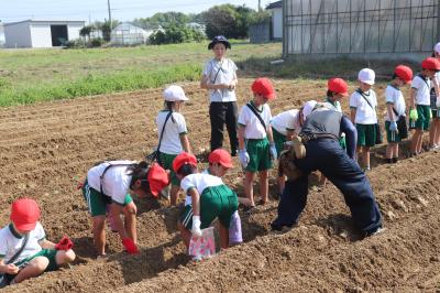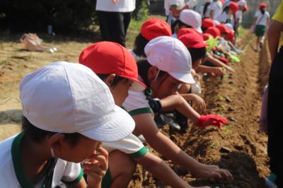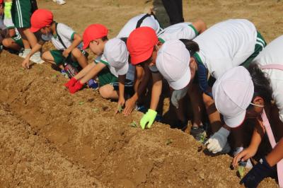 農業ボランティアのかたに植え方を教わりながら,畑一面に植えつけました。