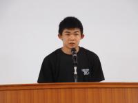 2学期の抱負の発表では、2年代表生徒が「1学期を振り返りながら、学習と水泳クラブの活動の両立についての想い」を述べていました。
