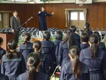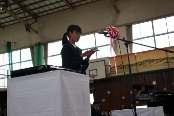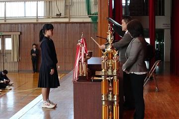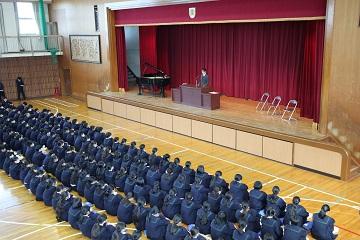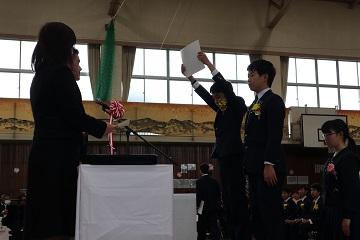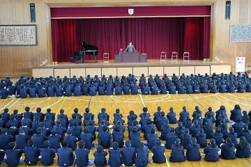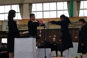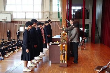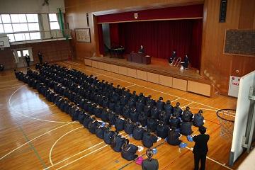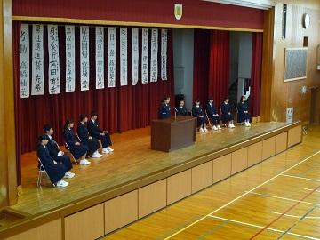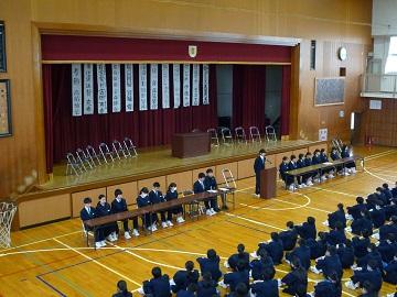 | | 3月23日(金)に修了式が行われました。はじめにバレーボール部が2大会で優勝した表彰の格納と絵画コンクールでの入賞者への表彰を行いました。次に平成30年度前期生徒会役員の任命式を行いました。 修了式では学年代表生徒が後期の反省と新年度の抱負を発表しました。どの発表も具体的な内容を発表し、とても立派でした。次に修了証を学年代表生徒に渡し、校長先生の話では、生徒の1年間の頑張りを褒め、今後も「ALL FOR ALL]のスローガンのもと、日々の生活の中で絆・居場所づくりをしてさらに生徒主体の活動をめざしていこうとお話がありました。 また、3年間国際教室を指導していただいた先生からお別れのお話をいただきました。 生徒一人一人が来年度への期待をもつよい修了式でした。 |