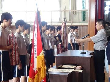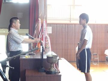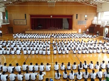 | | 8月31日(木)に、夏休みあけ全校集会を行いました。 長い夏休みを元気に過ごすことができた生徒たちと再会できることはとてもうれしいことです。 まずは、表彰を行いました。全国大会ベスト16まで勝ち進んだバレーボール部の数々の表彰、そして、水泳部・陸上部のリレーや個人の表彰も行いました。 表彰の後、校長先生から、「望遠鏡」と「双眼鏡」と「自分の目」についての話があり、狭い視野でなく広い視野をもって物を見たり考えたりしてくださいという話がありました。 会の後、連絡として安全と生徒指導担当の先生からの話を聞き、会を終えました。 みんなが元気にスタートを切れるといいなと思います。 |