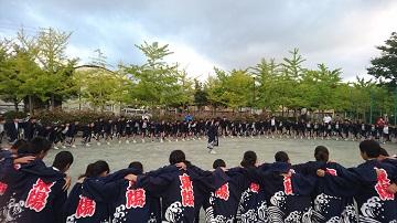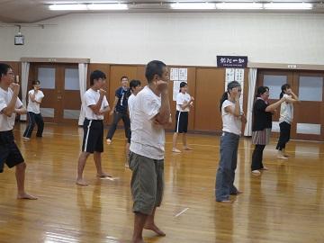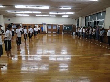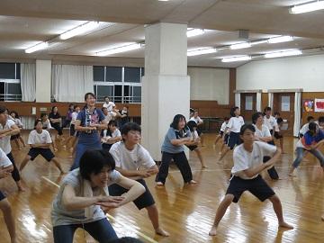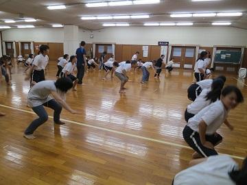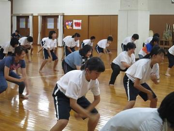 | | 8月24日にPTAのソーラン練習会を行いました。 9月に行われる東陽中学校体育祭の折に、全校でソーラン踊りを演技しますが、その時に、PTAの有志の方にも参加していただきます。そのための練習会を、この夏休み中を利用し、しかも、ソーラン実行委員の生徒がPTAの方に教えるという、PTAと生徒とのふれあいの場ともなっています。 実際に踊ってみると、結構ハードな運動であるソーラン踊りです。PTAの方は生徒の気持ちになり精いっぱい、実行委員の生徒は、できる限り優しく指導している姿は、ほほえましくもあり、いいひと時を過ごすことができました。 |