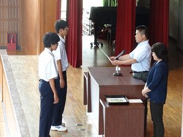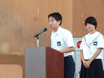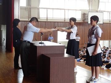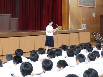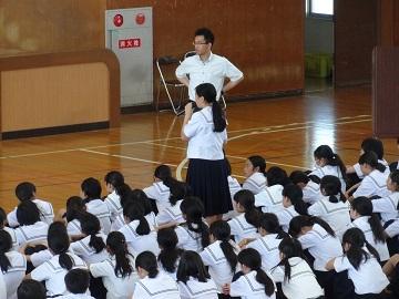 | | 6月1日(木)全校集会を行いました。 これまで、集会は、すべて月曜日の朝に行っていましたが、延長することもあり、可能な限り木曜日6限に行うようん変更しました。本日は、その最初の日です。 表彰関係では、大会で優秀な成績をおさめた陸上競技部の2名とバレーボール部で優秀選手賞をいただいてきた2名の表彰を行いました。その後、委員会・生徒会会長からの話がありました。校長先生からは、各学年が実施し成功裏に終わった修学旅行や校外学習などの行事で培った皆さんの成長を、日頃の生活に生かしてくださいという内容の話がありました。 諸連絡の後、集会は終わり、各学年の先生からの話を聞いて終わりました。 |