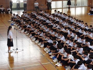 | | 6月16日(金)、この日は、6月18日(日)の「豊橋・学校いのちの日」に先立ち校内で命について考える日としました。 まず、朝の会の時に、教務主任の先生から。「豊橋・学校いのちの日」が設定された経緯と意義について話していただき、全校で黙とうをしました。6時間目には、終戦当時、中学生女工として豊川海軍工廠(こうしょう)で働き、空襲により多くの友達を目の前で亡くされた後藤和子さんを講師としてお招きし、お話を聞きました。生で戦時中の話を聞くことが今ではなくなりつつある中、生徒たちにとっては貴重な体験でした。当時の記憶をたどりながらお話をされる後藤さんの言葉には一つ一つ重みがあるように感じました。 集会後、各クラスで振り返りを書きました。 後藤さんの講演の中で、何度も出てきた「命を大切にしてください」という言葉が、いつまでも耳に残っています。 |