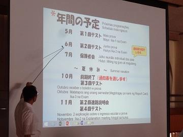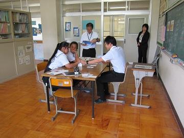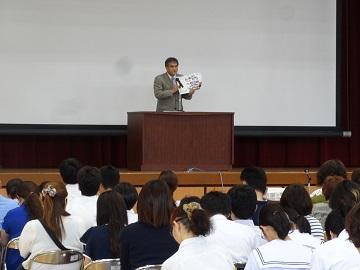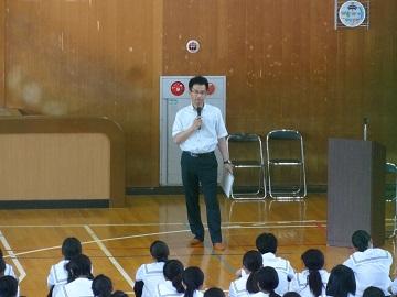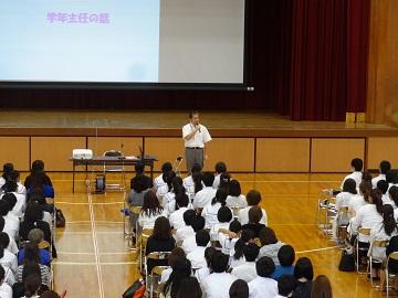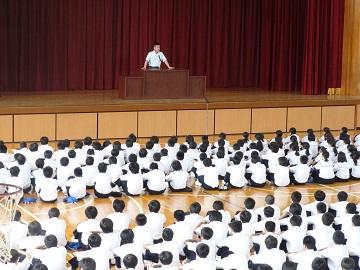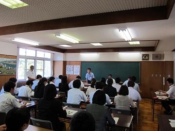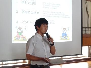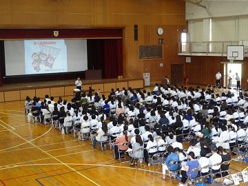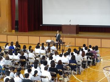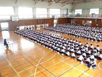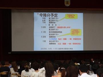 | | 6月22日(木)に3年生の進路説明会がありました。 今回の進路説明会では、高校の先生から学科の様子や高校生活の様子を聞くことと、進路指導主事から進路に関する概略を聞くことで、各自の進路選択の参考にすることを目的にしています。また、外国人生徒とその保護者にも、将来に向け夢と希望をもってもらうために、別に説明会を開催し、日本社会における進路情報をわかりやすく説明しました。この取り組みは、おそらく他の学校ではみられない取り組みです。 生徒も保護者も、該当学年として真剣に話を聞くことができました。目標を持ち、その目標に向かって頑張るきっかけになってくれればと思います。 |