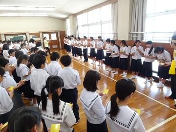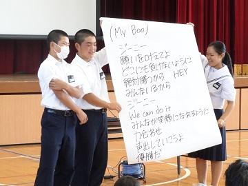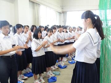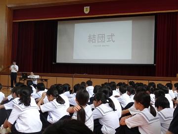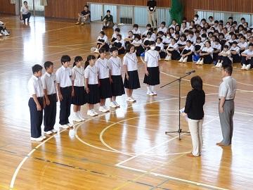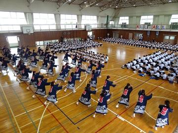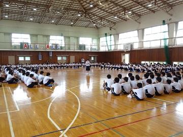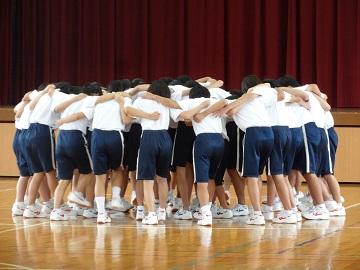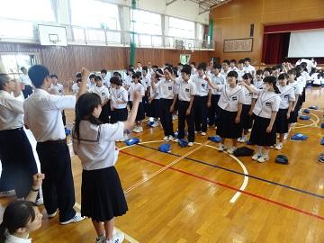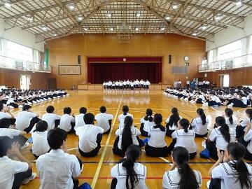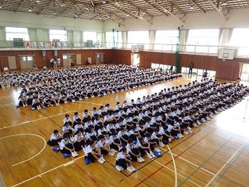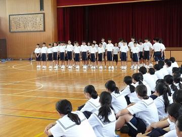 | | 6月19日(月)に生徒朝会を行いました。まず、校内や校外で活躍した生徒を対象とした「弓張賞」の表彰と「豊橋・学校いのちの日」の取り組みに関して校長先生から話がありました。 それが終わった後、4つの団の結団式です。まずは、各団ごとに集まり、結団式で披露する団のパフォーマンスの練習を行いました。各団ごと、3年生が中心に考えてきたパフォーマンスを練習しました。練習後、体育館に集まりました。各団のキャラクターを体育館ステージにプロジェクターで大写しにし、パフォーマンスを披露しました。 これから1年間、学年の垣根を越え、様々な取り組みを団で協力し行います。その出発の日として、意識を統一することができました。 |