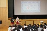 吉田方中学校の1年生が小学校にやってきて、4年生に防災に関する発表をしてくれました。
