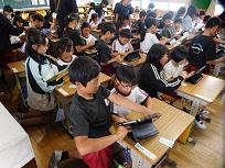 6年生では夏休みの思い出をタブレットにまとめてみんなに共有しています。