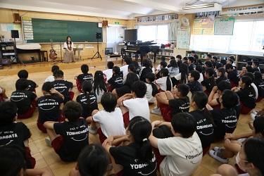 6月18日は豊橋・学校いのちの日です。吉田方小学校では、柳田はるかさんをお招きして、お話や歌を聞いたり、一緒に歌を歌ったりしました。熱中症が心配されたため、体育館での講演をやめて、6年生が音楽室で柳田さんの講演を聞きました。1~5年生は教室でオンライン配信を見ながら講演を聞きました。