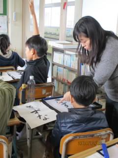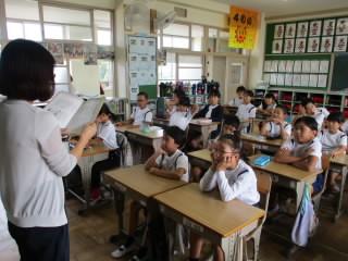 1年生の授業風景です。国語の漢字のまとめです。「似ている漢字」を発表していました。「貝と見です。」「右と石です。」「そうですね。形は似ているけど、書き順は違うので気を付けてね。」