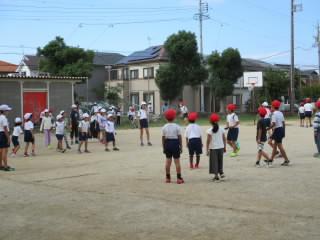 今日も暑いですが、昨日ほどではなかったので、1年生と6年生が仲良く「しっぽとり」をして遊びました。6年生発案の企画です。1年生は、とても楽しそうでした。