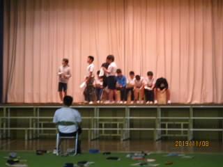 体育館のステージ上では、ダンスクラブが踊りの振り付けを考えていました。