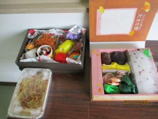 手芸クラブです。かわいいキャラクターのマスコットやティッシュカバーを制作していました。