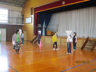 1年生の体育の授業です。ウサギさんになって跳ねながら前進したり、ケンケンパーで進むなどいろいろな動きに挑戦していました。