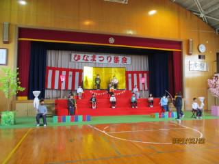 3年生です。全身の動きを表現しました。テーマは、「とんとんたいそう」です。