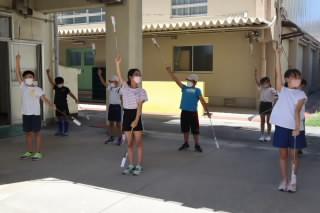 2年生は、体育の授業を行いました。卒業の練習のため体育館が使えず、雨のため運動場も使えないため、音楽室で行いました。