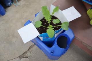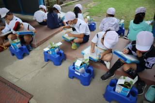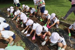 【2年】生活科の授業で野菜を育てます。ミニトマトやキュウリなど、各自で用意した苗を鉢に植えました。
